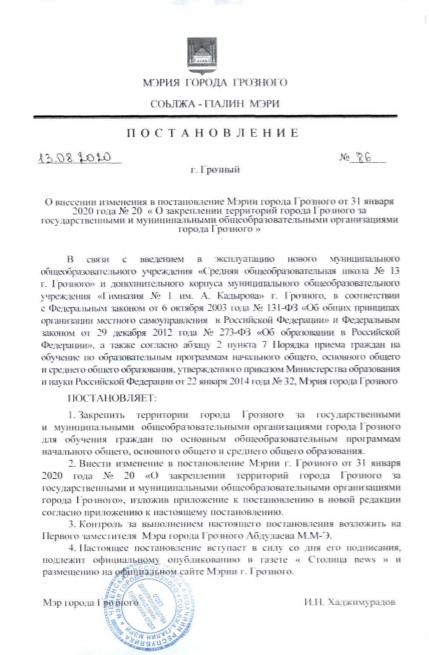 14.08.2020Постановление Мэрии города Грозного от 13 августа 2020 года № 86 «О внесении изменения в постановление Мэрии города Грозного от 31 января 2020 года № 20 «О закреплении территорий города Грозного за государственными и муниципальными общеобразовательными организациями города Грозного"