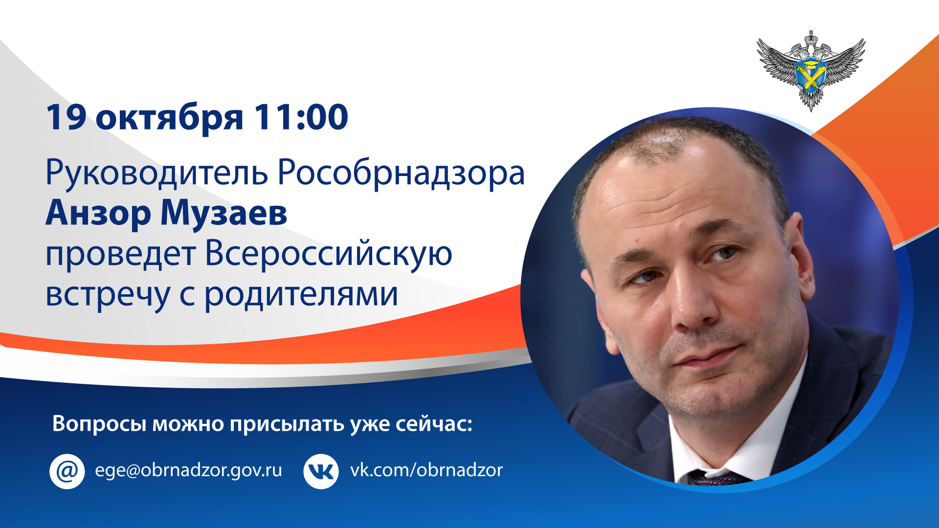 В настоящее время уже принимаются вопросы Анзору Музаеву. Задать их можно на странице Рособрнадзора в социальной сети «ВКонтакте» и по электронной почте ege@obrnadzor.gov.ru