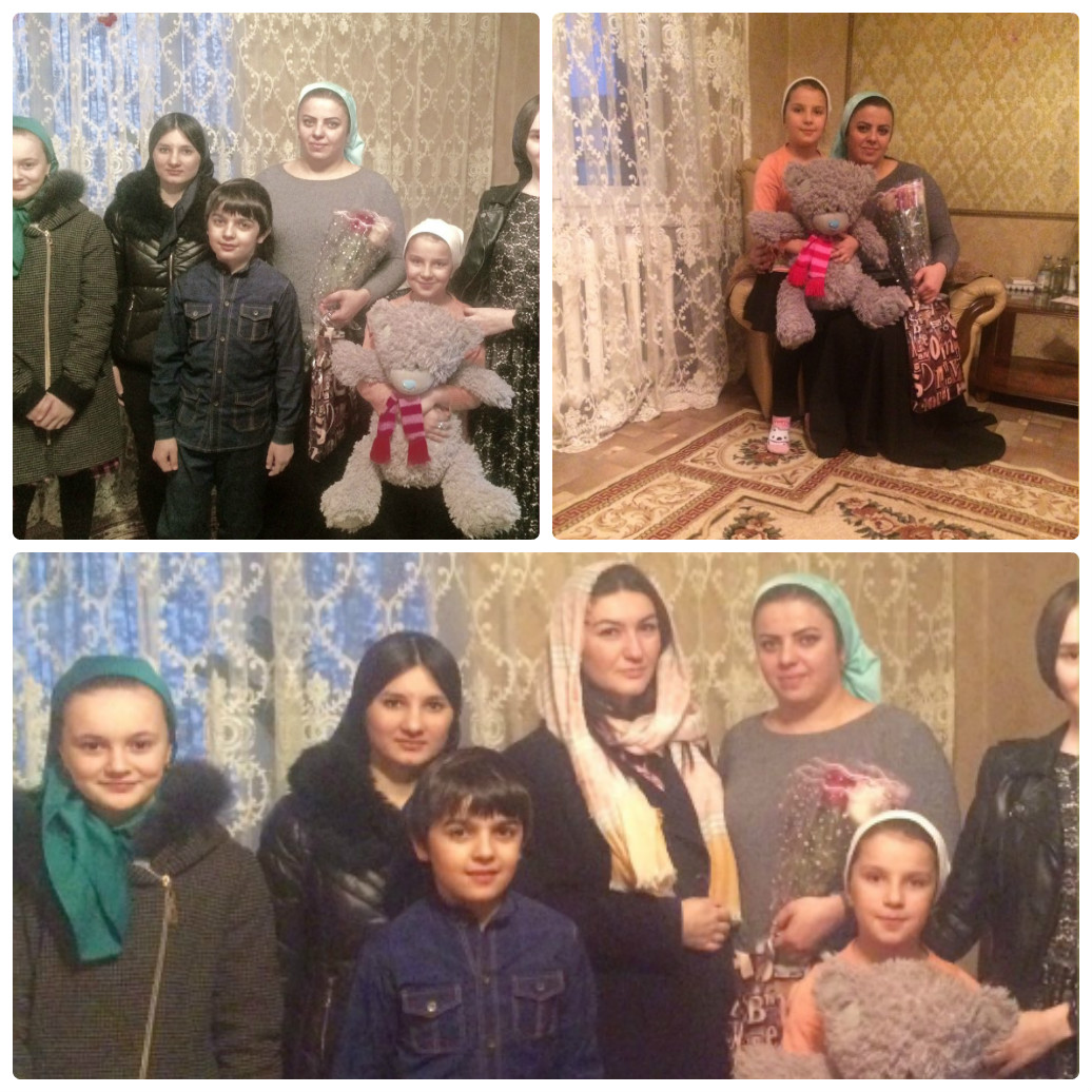 25.11.2016Ежегодная акция «Нохчийн сийлахь нана» по оказанию внимания матерям военнослужащих и сотрудников правоохранительных структур, погибших при исполнении служебного долга проведена 25.11.16г. Патриотический отряд «Юные Кадыровцы» , совместно с ШУС, посетили вдову сотрудника погибшего при исполнении служебного долга, Закараеву Сациту, которая воспитывает двоих детей. Ребята приготовили для них небольшие подарки.