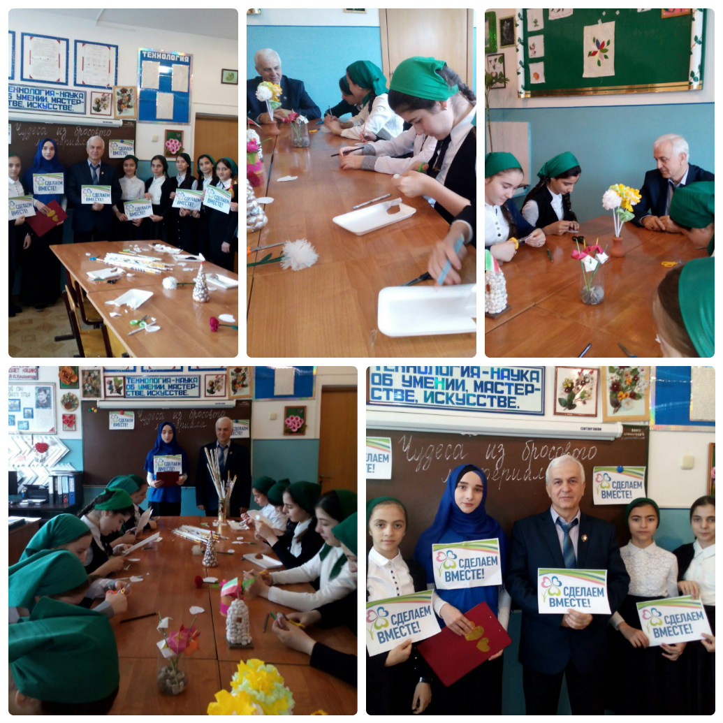 11.04.201711 апреля в рамках Акции Всероссийский экологический урок «Сделаем вместе» в МБОУ "СОШ №14" г. Грозного, с учащимися 5-х классов в количестве 45 человек, проведен экоурок на тему «Чудеса из бросового материала». Мероприятие организовали и провели эколидеры Хултыгова Фирдовс и Юсупова Иман .